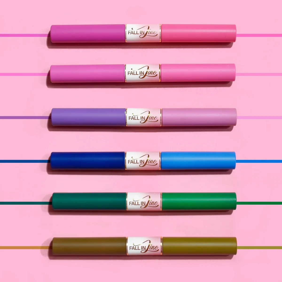 It’s light, gliding texture dries quickly whilst allowing you an easily-buildable and highly pigmented coverage with zero budging or flaking. Developed with smart self-setting properties to achieve long-lasting wearability that lasts up to 24 hours. Not to mention, a double-ended tool that includes, not just one, but TWO different shade combinations. Get ready to fall in love and Fall In Line…
